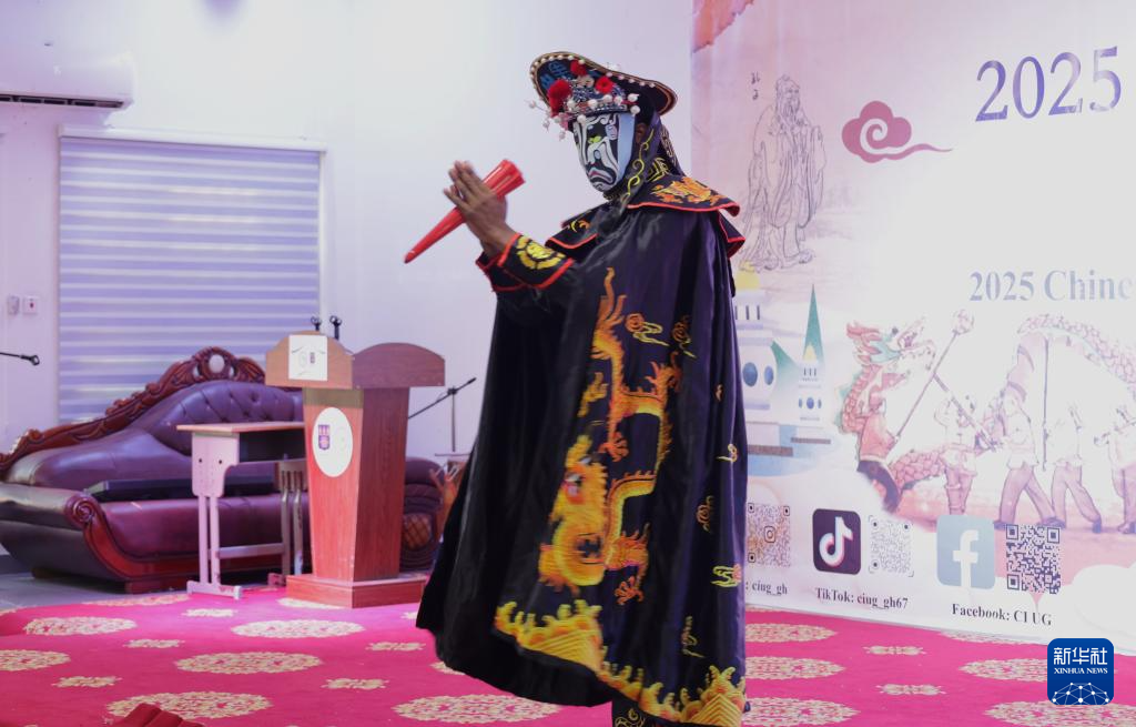 12月30日,在加纳首都阿克拉,加纳大学孔子学院学生在2025年“中国大使奖学金”颁奖仪式上表演川剧变脸。新华社记者 高剑飞 摄