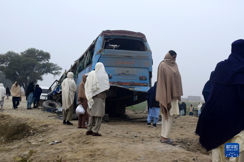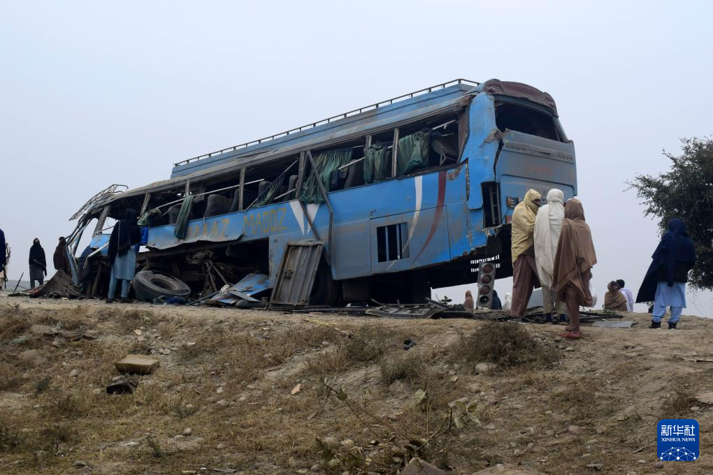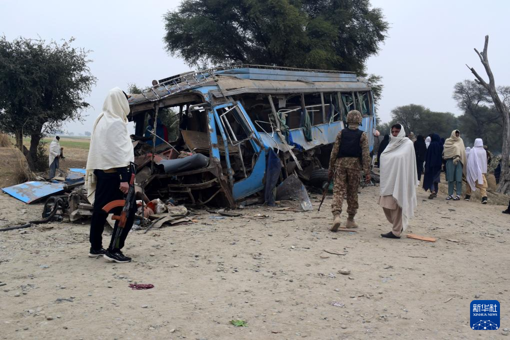 1月5日,在巴基斯坦西北部开伯尔-普什图省勒吉默尔沃德地区,人们聚集在损毁的巴士周围。新华社发