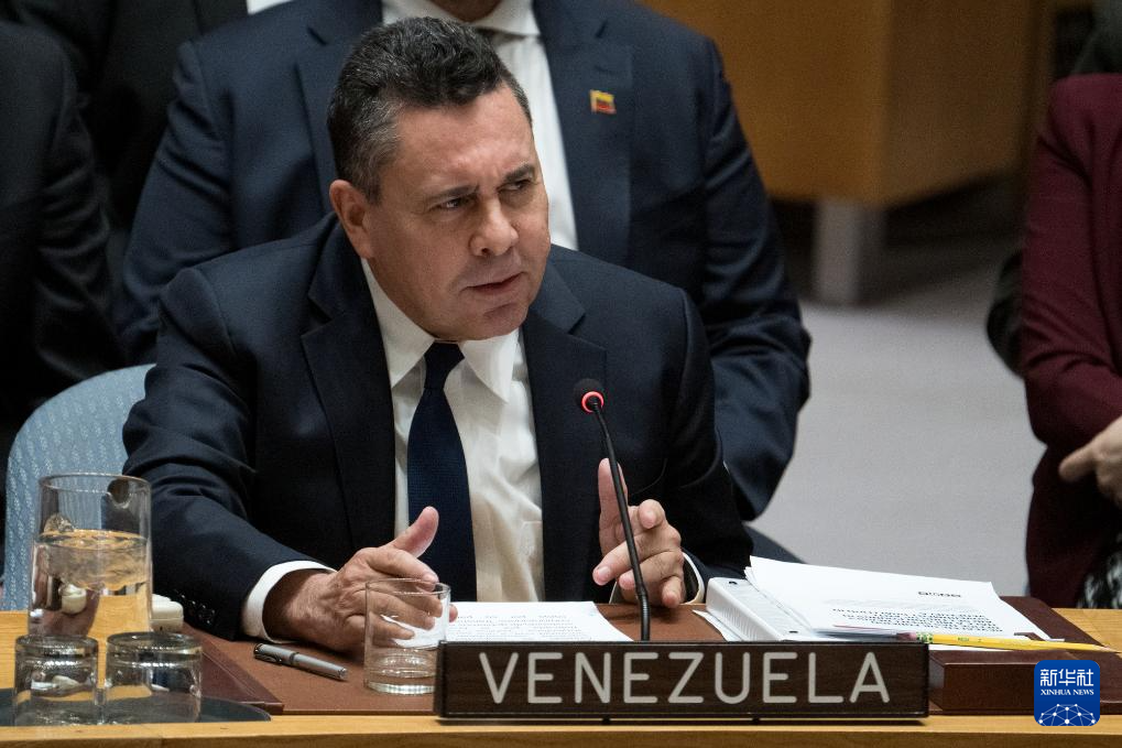 1月5日,委内瑞拉常驻联合国代表萨穆埃尔·蒙卡达在位于纽约的联合国总部举行的安理会委内瑞拉局势紧急会议上发言。新华社发(联合国供图/马克·加滕摄)