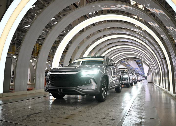 2025年11月3日在郑州航空港区比亚迪总装工厂拍摄的新能源汽车“宋Pro”生产线。