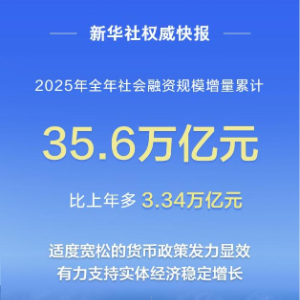 中国人民银行1月15日发布金融统计数据显示,2025年全年社会融资规模增量累计为35.6万亿元,比上年多3.34万亿元。2025年12月末,广义货币(M2)余额340.29万亿元,同比增长8.5%;人民币贷款余额271.91万亿元,同比增长6.4%。适度宽松的货币政策发力显效,有力支持实体经济稳定增长。