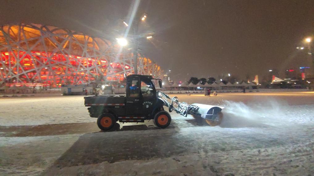 北京环卫集团城市机扫公司在奥林匹克公园中心区开展除雪作业。新华社发