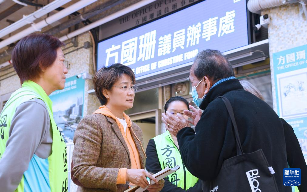 1月13日,香港第八届立法会议员方国珊(左二)与调景岭善明邨街坊交流。新华社记者 陈铎 摄