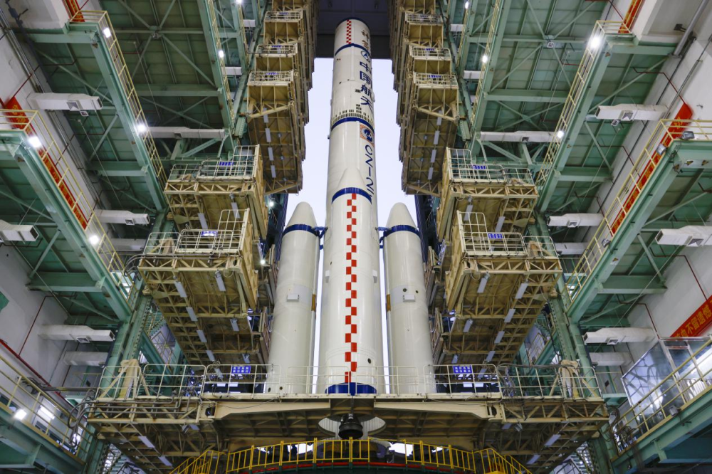 ↑长征二号F遥二十二运载火箭转移到待发测试工位(2025年11月8日摄)。新华社发(李明堂 摄)