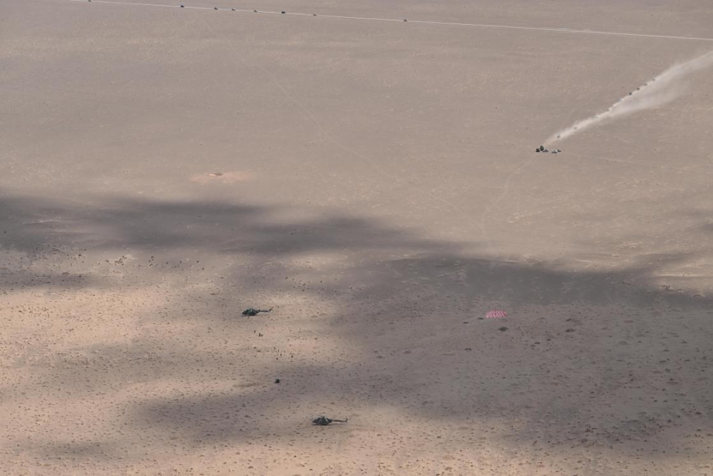 ↑2025年4月30日空中俯瞰神舟十九号载人飞船返回舱着陆现场。新华社记者 李鑫 摄