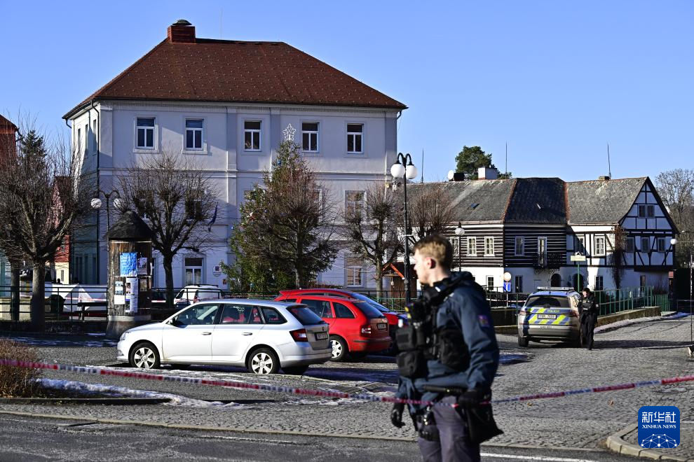 1月19日,一名警察站在捷克赫日布斯卡的枪击事件现场附近。新华社/美联