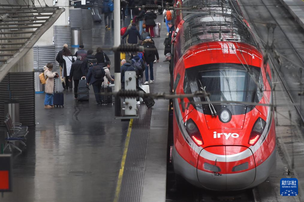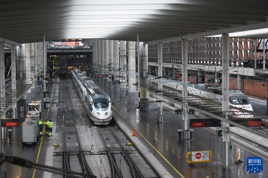 1月21日,在西班牙马德里,两列高铁列车在阿托查车站附近行驶。新华社发(古斯塔沃·巴连特摄)