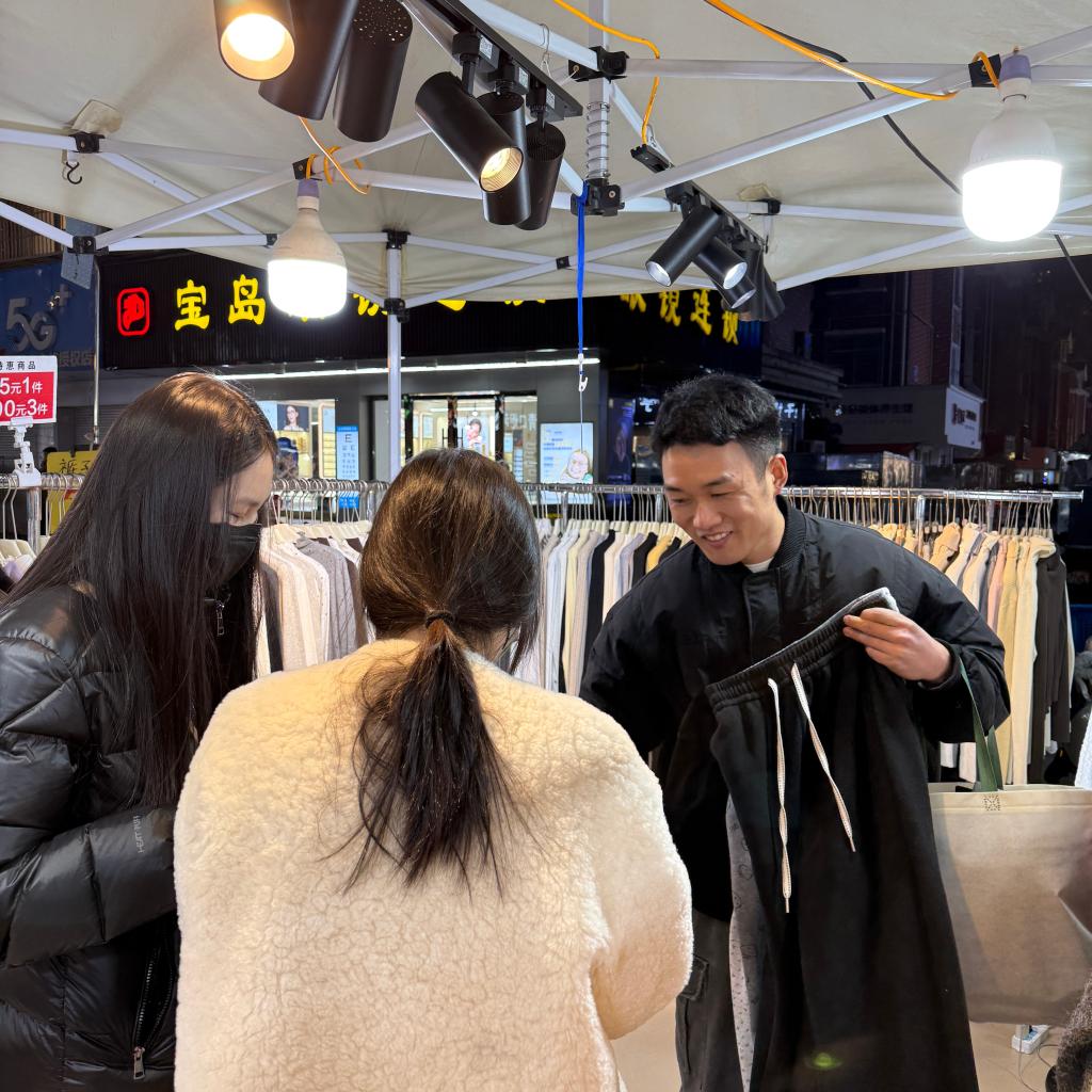 柴文园(右一)向顾客介绍摊位上的小商品。(受访者供图)