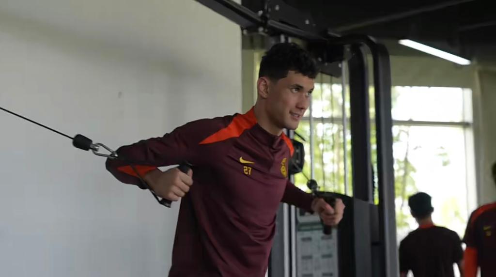 U23国足队员拜合拉木在集训中进行力量训练。(视频截图)