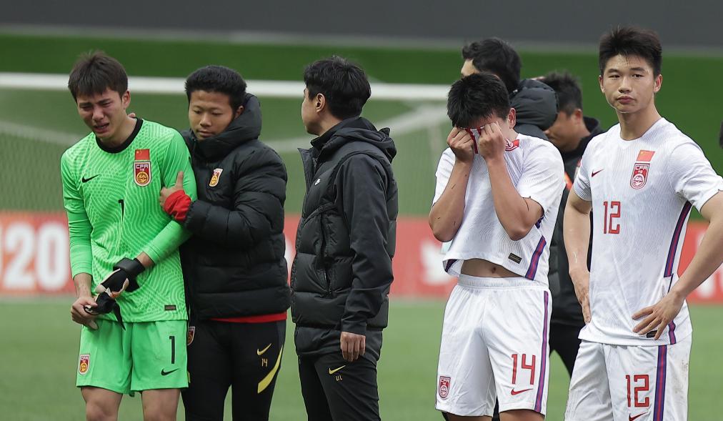 2023年3月12日,中国队球员在比赛后。当日,在乌兹别克斯坦塔什干举行的2023年U20男足亚洲杯四分之一决赛中,中国队以1:3不敌韩国队,无缘四强。新华社发(车周勇摄)