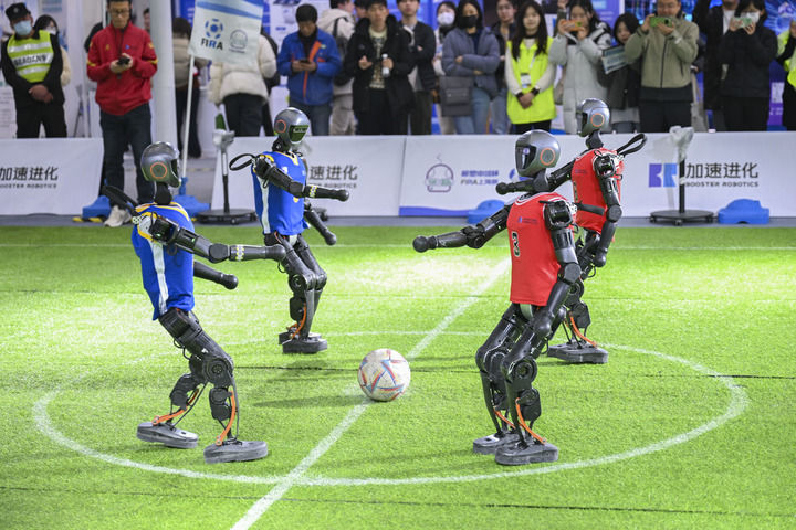 2025年2月21日,机器人在2025全球开发者先锋大会现场踢足球。(新华社陈浩明 摄)