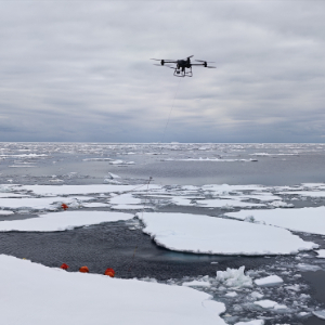 船时2026年1月25日4时许,“雪龙”号无人机抛下的锚钩成功捕获“锚碇式潜标观测系统”(俗称潜标)缆绳。(受访者供图)