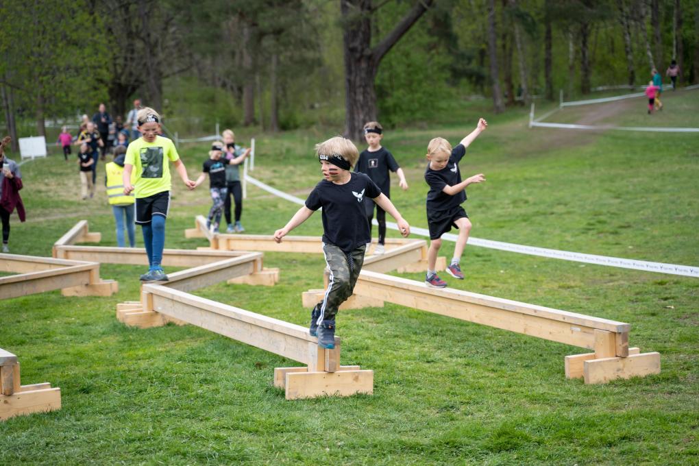 2019年5月11日,2019“维京铁人”挑战赛在瑞典首都斯德哥尔摩举行,近千名5至11岁的儿童参加了当天的比赛。这是参赛者在比赛中跨越障碍。新华社发(魏学超摄)