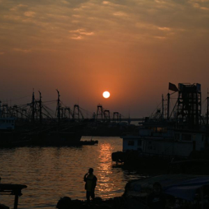 红日初升,发动机哒哒的声音响起,接驳船驶离港口,船员们带着空筐回到渔船上,开启新的一天。
