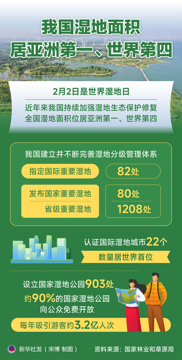 新华社北京2月2日电(记者黄垚)2月2日是世界湿地日。记者当天从国家林业和草原局获悉,近年来我国持续加强湿地生态保护修复,全国湿地面积位居亚洲第一、世界第四,湿地保护形成重点治理和分类保护相结合的新格局。