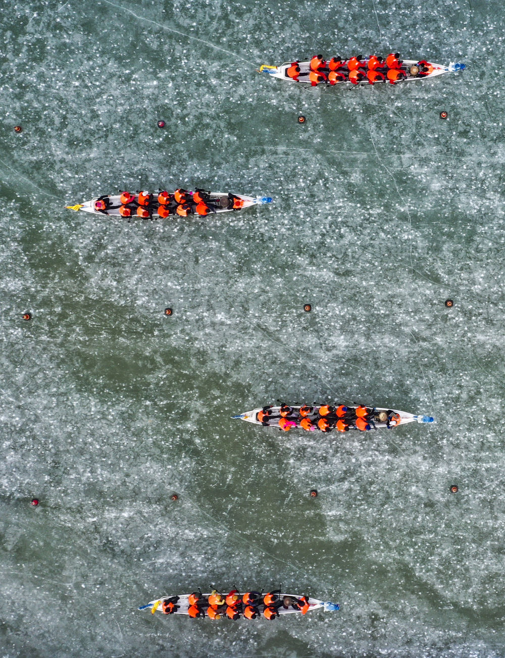 2022年1月8日,市民在宁夏银川阅海湖面上参加冰上龙舟比赛(无人机照片)。新华社记者冯开华摄