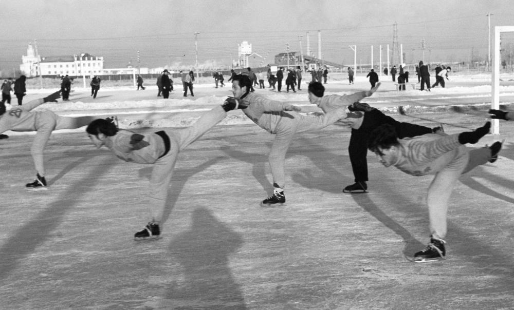 1954年,东北农学院、东北林学院的学生在哈尔滨市练习滑冰。新华社记者胡伟摄