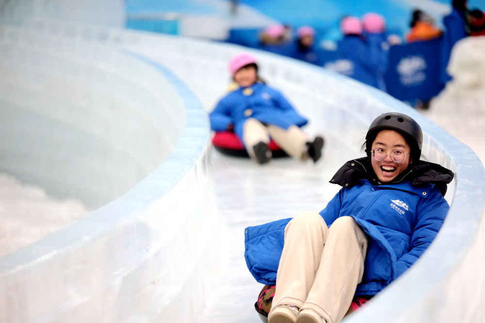 2025年1月29日,游客在江苏省南通市南通森迪冰雪海洋乐园体验冰雪游乐项目。