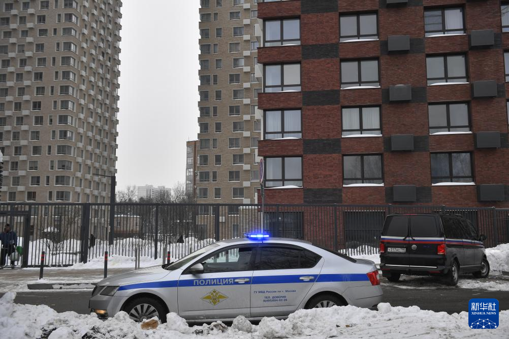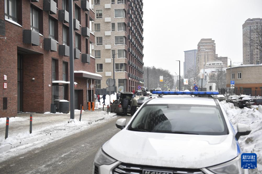 2月6日,在俄罗斯首都莫斯科,警车停在发生枪击的居民楼附近。新华社发(亚历山大摄)