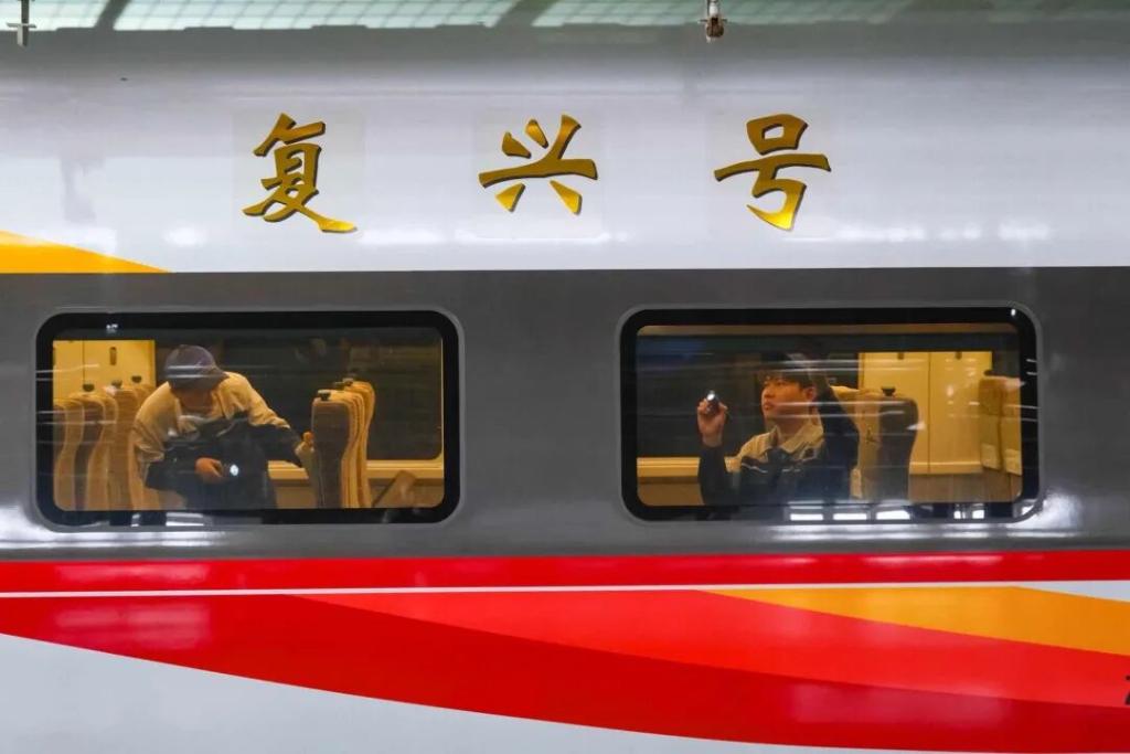 春运首日,深圳动车运用所检修库内,透过车窗能看到正在对座椅和窗帘做检查的机械师。@V〃