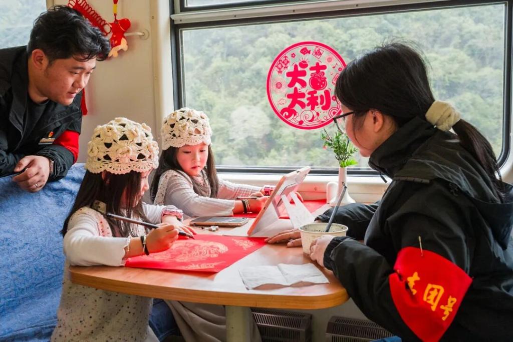 2月4日,K4287次“共青团号”列车上,两名青年列车员正与一对双胞胎姐妹互动。@朱仕炜