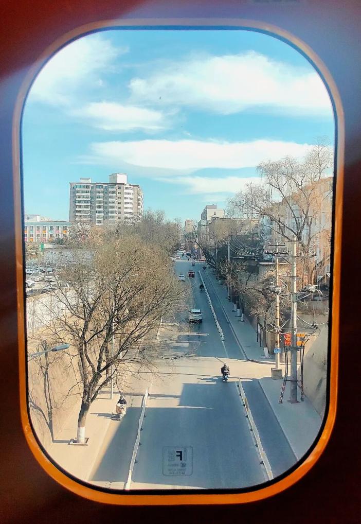 2月2日,D1657次,阳泉至太原的列车上随手拍。车窗的黄色玻璃框比较特别。太阳暖暖的,天格外蓝,恰好几朵白云飘过,城市街道与飞驰列车交汇成彩色的美好。@揆叙