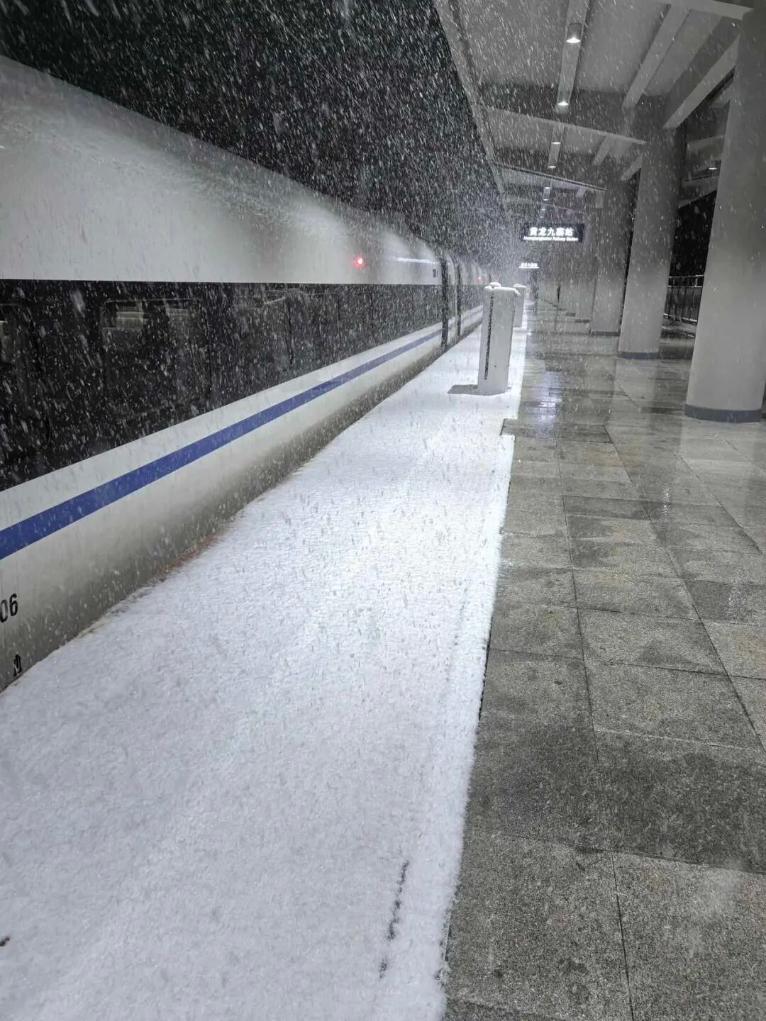 夜幕沉沉,雪花飘飘落下,在黄龙九寨站的站台上簌簌堆积。银白的高铁列车静立在风雪里,与被雪覆盖的站台连成一片。当城市渐入梦乡,我们依旧在风雪中坚守,只为让每一趟列车都能准点出发,让每一位旅客都能平安抵达。@AaaL.