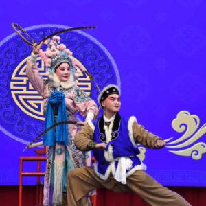 随着鼓点渐起,浙江婺剧团带来的“欢乐春节”专场演出开始,现场气氛迅速被推向高潮。“九节龙”在江南曲牌的旋律中腾跃翻滚、《挡马》中刀枪交错、《天女散花》中的长绸飞舞如云霞、《吕布试马》中的腾挪跳跃尽显功底……