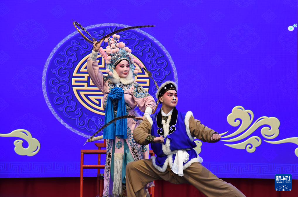 2月14日,在荷兰海牙市政厅,浙江婺剧团演员表演《挡马》。新华社发(孙晶晶摄)