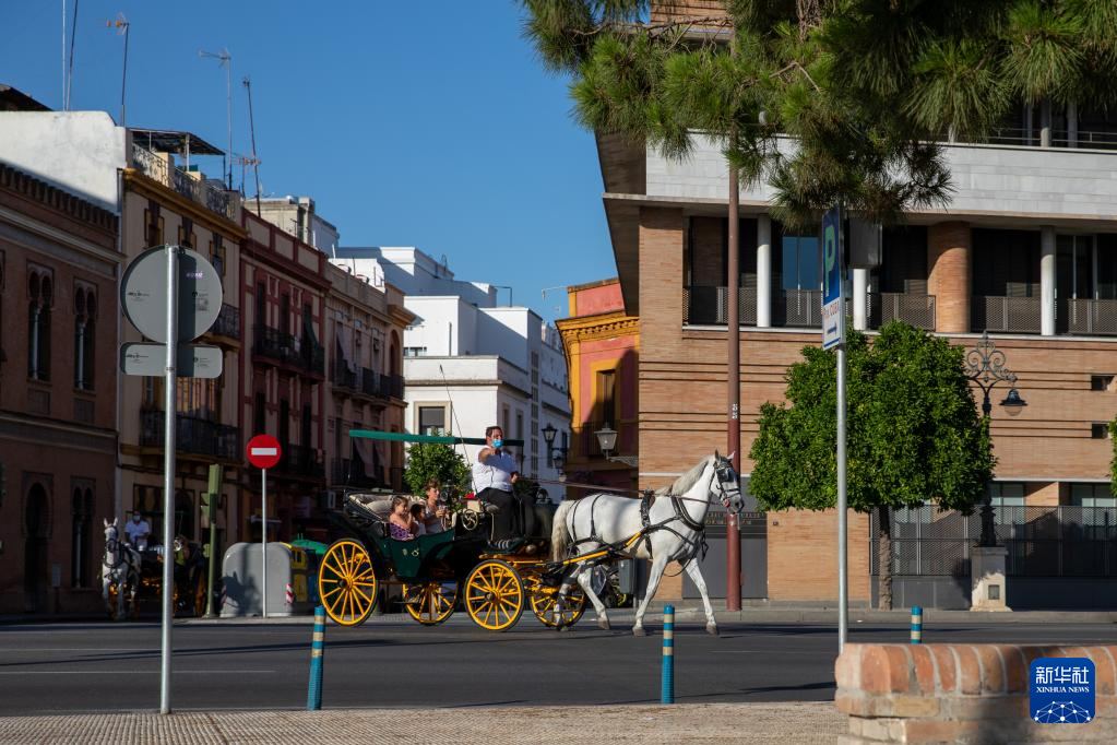 2021年6月25日,一辆马车驶过西班牙塞维利亚街头。新华社记者 孟鼎博 摄