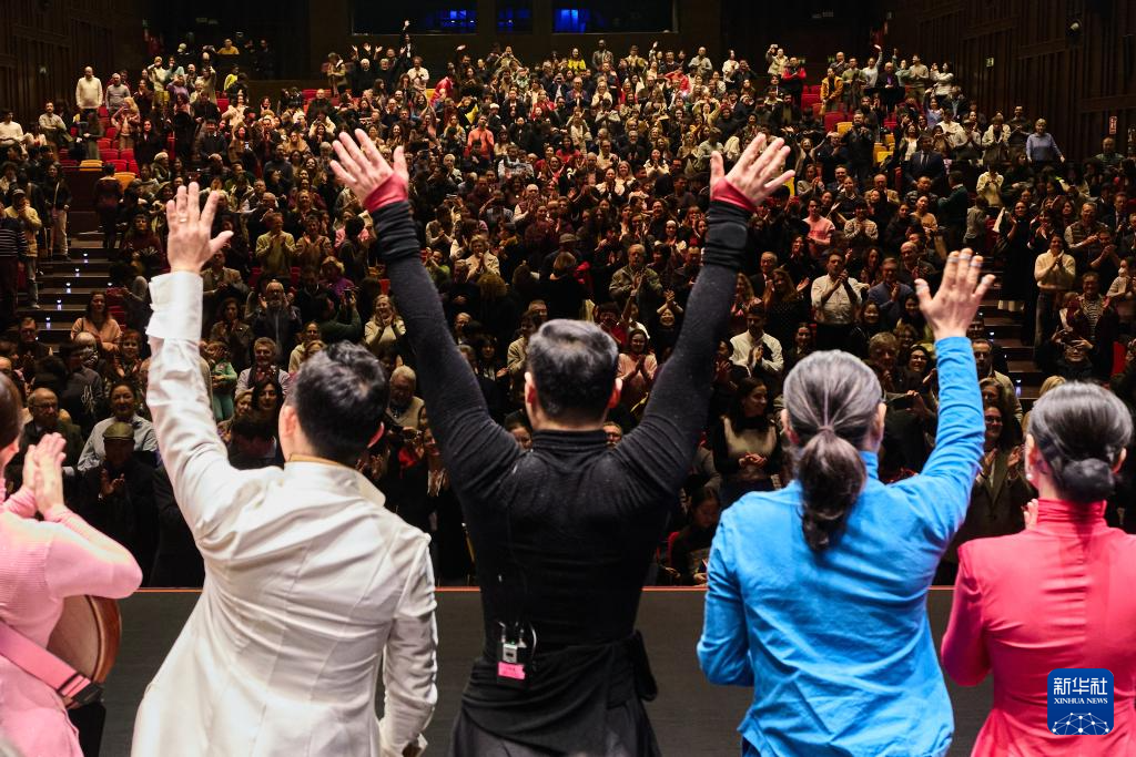 2月2日,在西班牙塞维利亚,上海民族乐团成员在《中国色》音乐会后谢幕。新华社记者 孟鼎博 摄