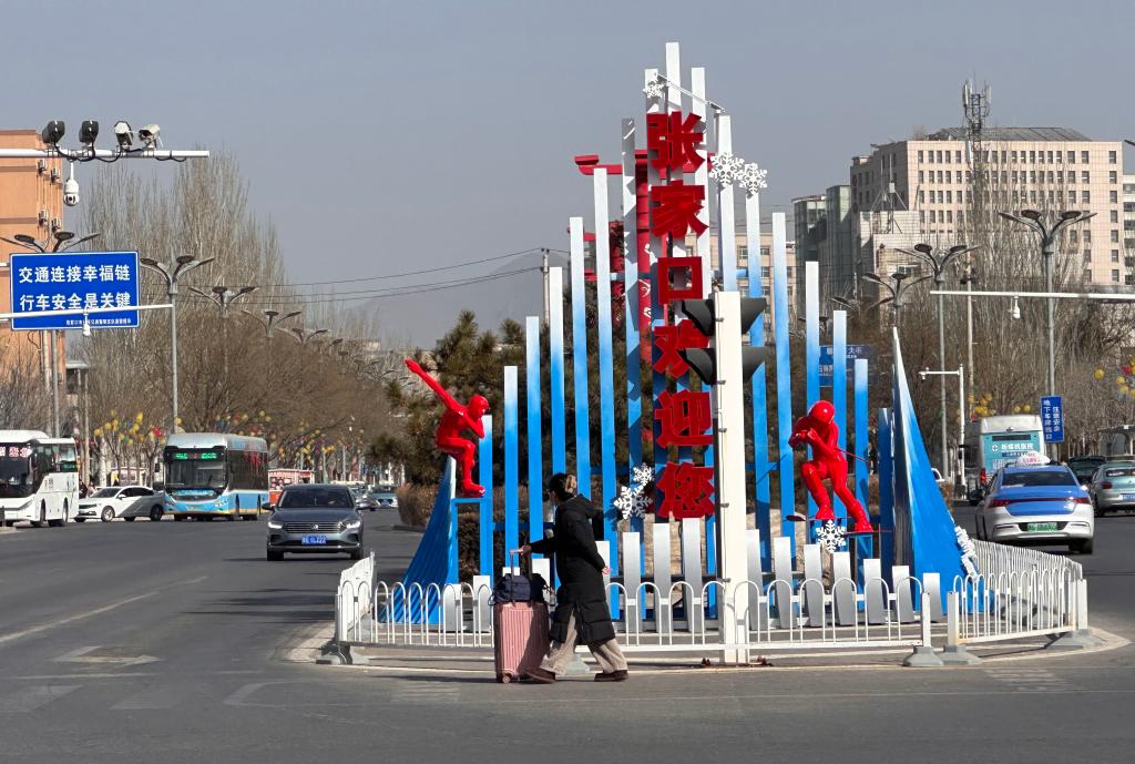 2月20日,一名前往京张高铁张家口站的旅客路过带有冬奥会标志的欢迎牌。新华社记者 唐霁 摄