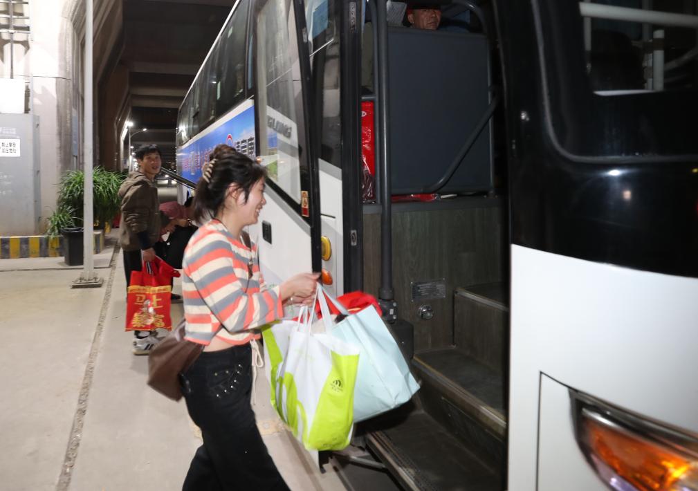 返岗人员抵达广州南站后登上接驳大巴去往务工地。新华社发