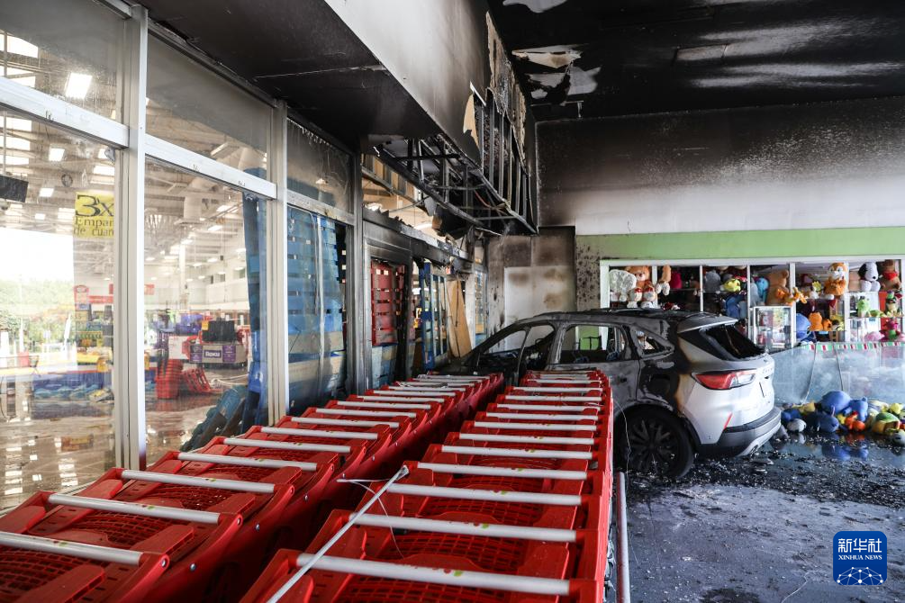 这是2月22日在墨西哥哈利斯科州首府瓜达拉哈拉拍摄的超市外被焚烧的汽车残骸。新华社发(迪亚娜·马克斯摄)