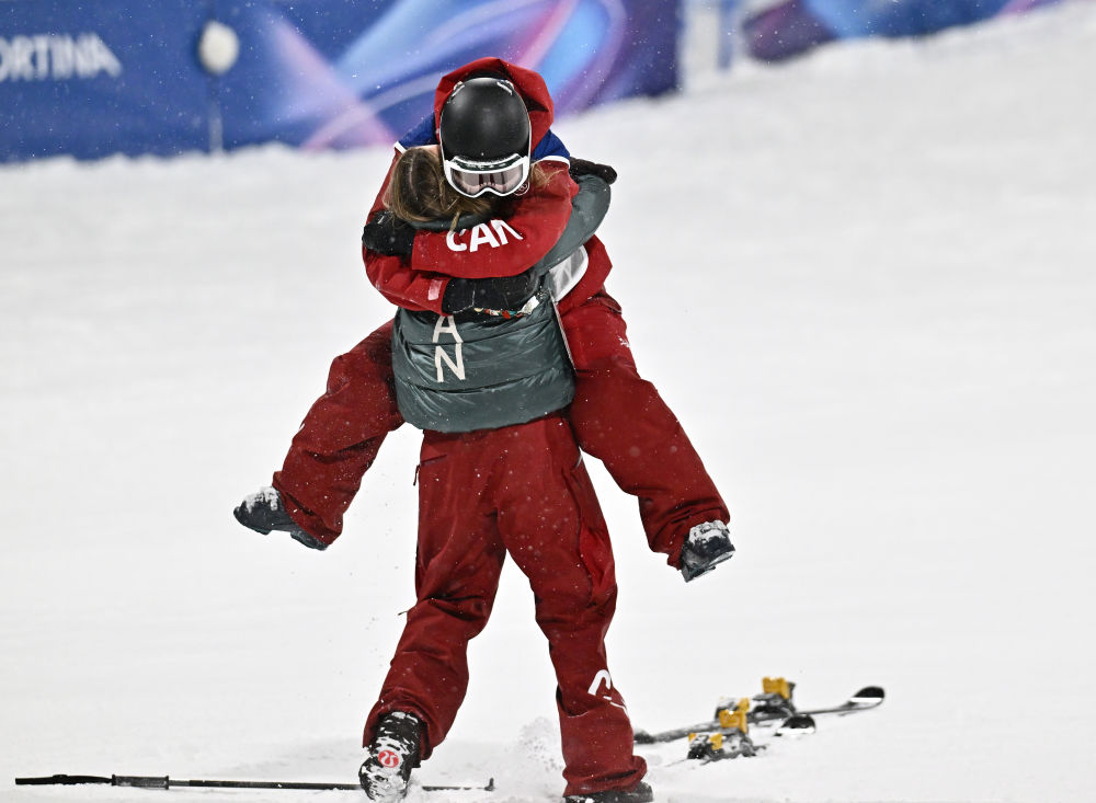 2月16日,加拿大选手梅根·奥尔德姆(后)在自由式滑雪女子大跳台决赛后拥抱队友。新华社记者 张宏祥 摄
