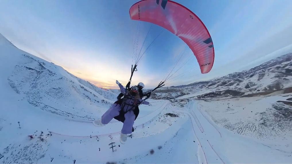 如今,新疆各大雪场早已不是单一的滑雪场地,而是成为融合运动、观光、文化和休闲的综合性度假目的地。在阿勒泰将军山国际滑雪度假区,滑翔伞划过雪道上空,热气球缓缓飘浮在雪场之上,与连绵的雪山相映成趣。