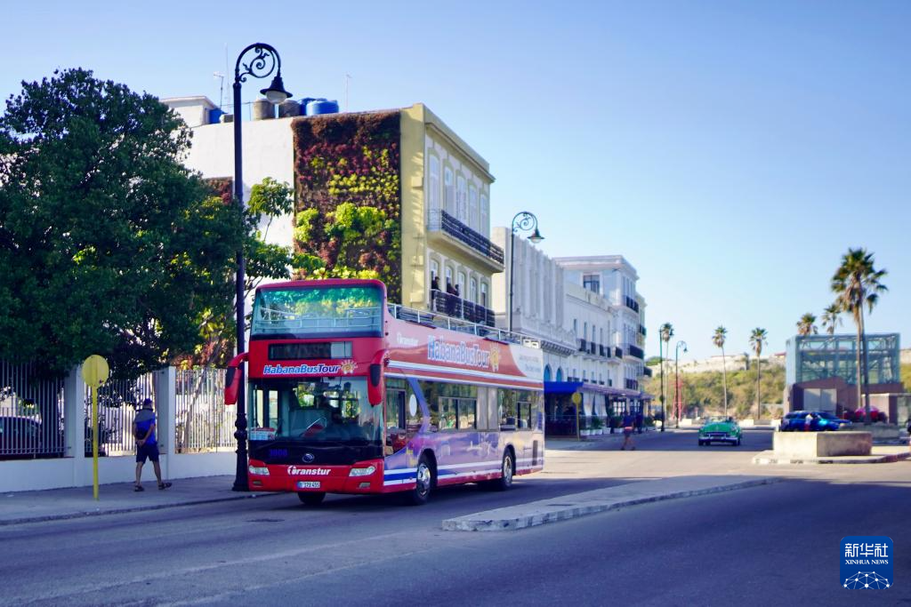 2月13日,在古巴首都哈瓦那,一辆旅游巴士行驶在街道上。新华社记者 蒋彪 摄