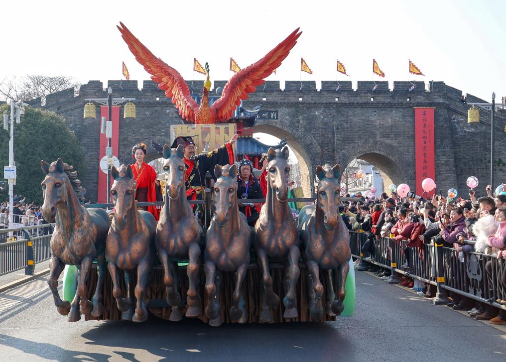 正月初三,“荆楚岁时记”年俗巡游在荆州古城荆南路上演。新华社发(肖琦 摄)