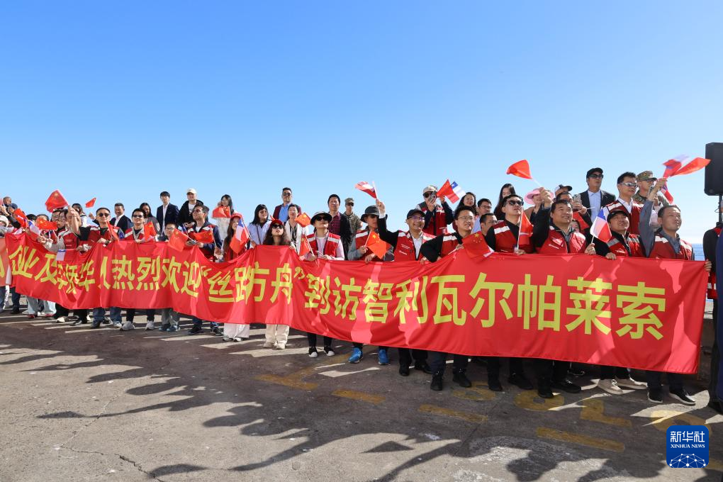 3月1日,执行“和谐使命-2025”任务的中国海军“丝路方舟”号医院船抵达智利瓦尔帕莱索港,民众在码头欢迎。新华社发(崔晓洋摄)