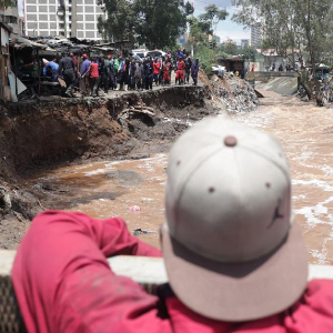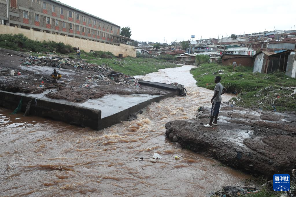 3月7日,在肯尼亚首都内罗毕,一名男孩站在小河边查看涨水情况。新华社发(纳明德摄)
