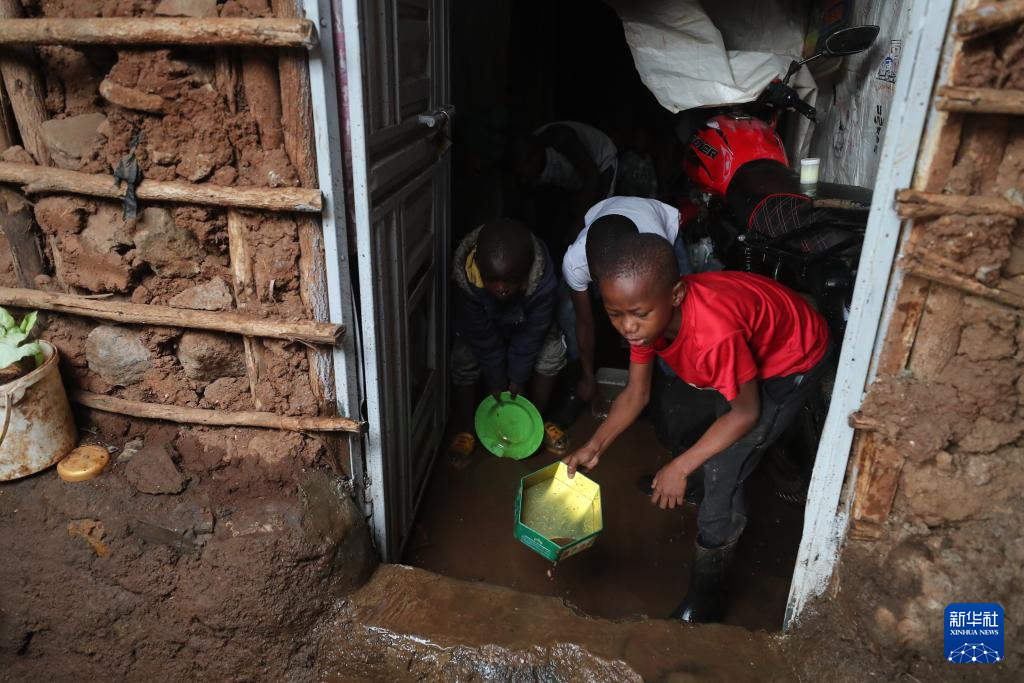 3月7日,在肯尼亚首都内罗毕,几名儿童将室内的积水排出。新华社发(纳明德摄)