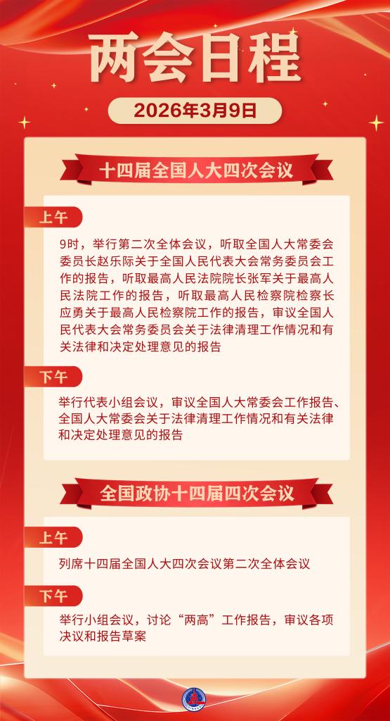 两会日程预告丨3月9日:全国人代会举行第二次全体会议 听取全国人大常委会工作报告和“两高”工作报告