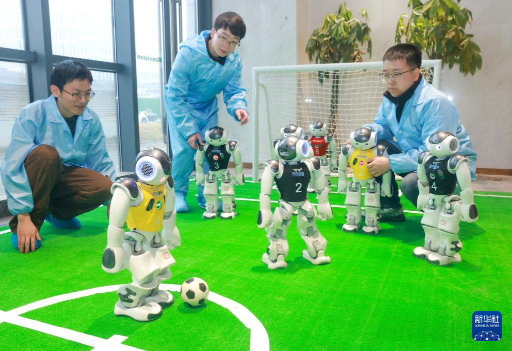 3月16日,湖北光谷盛创技术人员对机器人足球竞技对抗系统进行调试。新华社发(赵军摄)