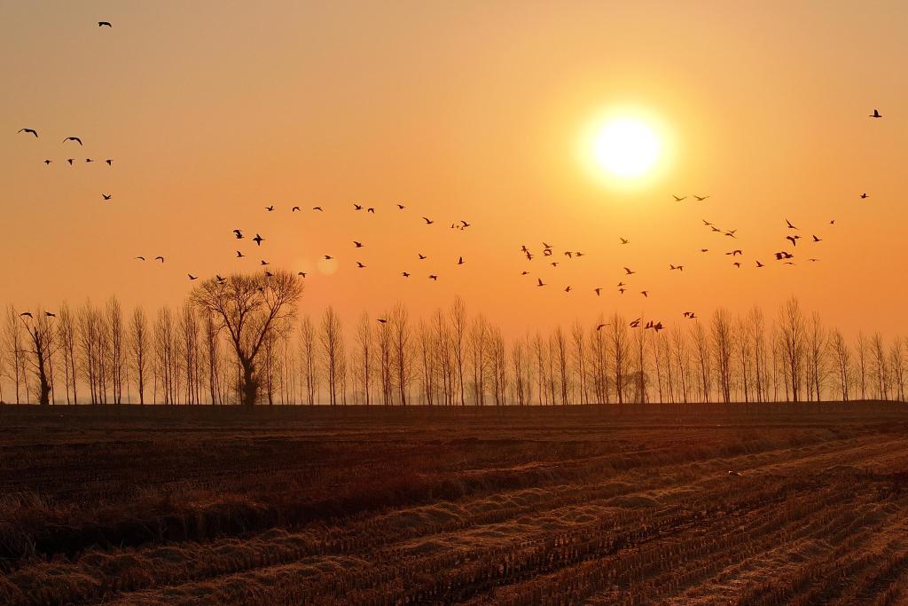3月15日,在黑龙江省牡丹江市宁安市渤海镇,北归大雁在朝晖中飞翔。新华社发(王宝勋摄)