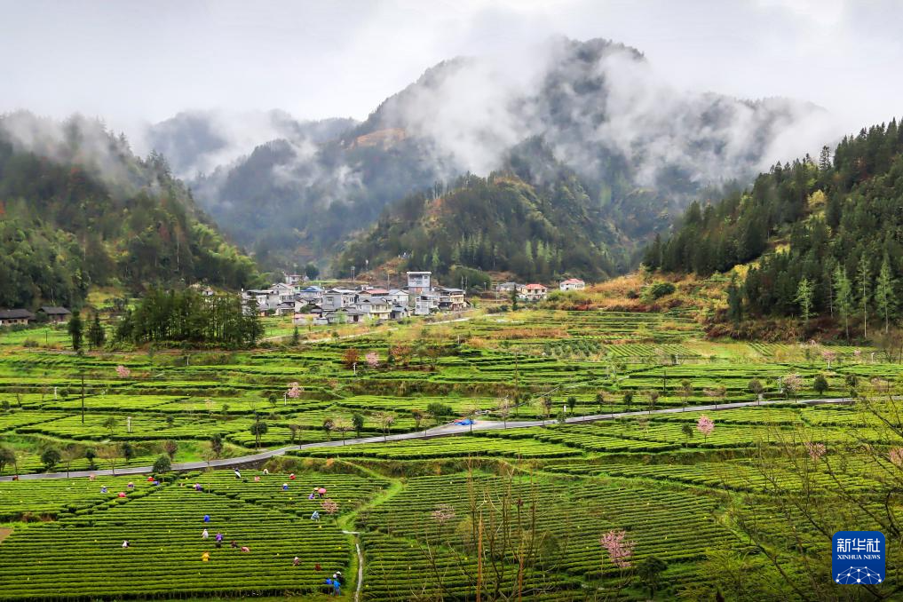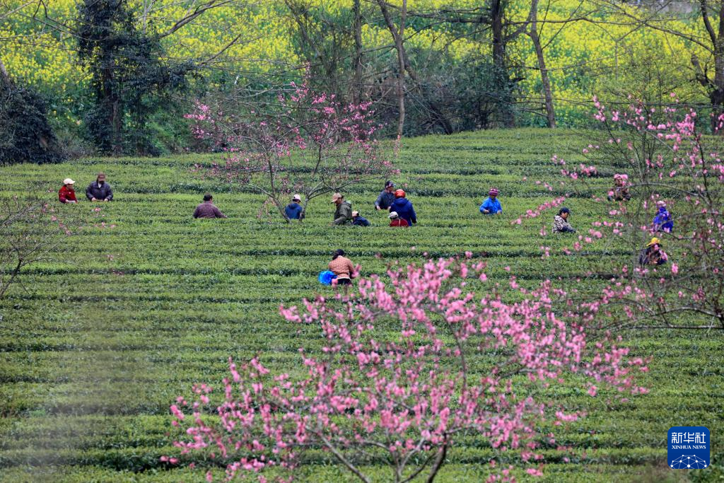 3月19日,在湖南省湘西土家族苗族自治州龙山县红岩溪镇肖家坪村,茶农在采摘春茶嫩芽。