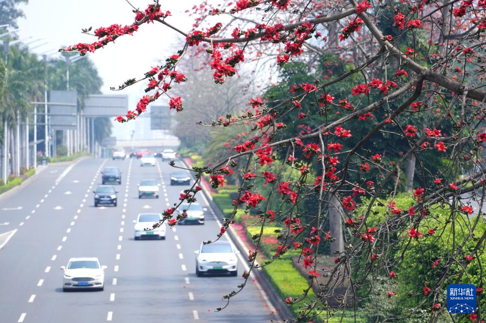 这是广西南宁市民族大道上盛放的木棉花(3月19日摄)。