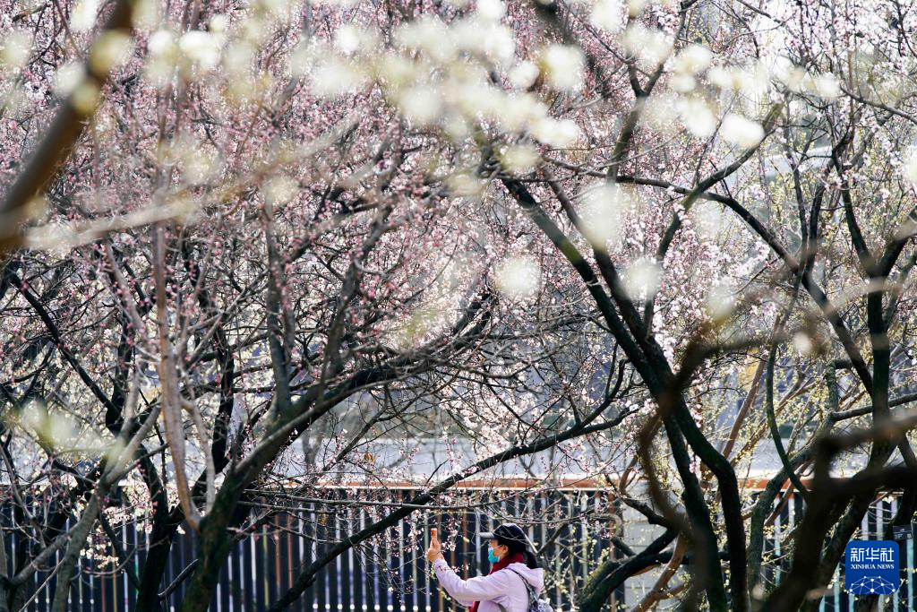 3月18日,人们在江苏省昆山市亭林园赏花拍照。