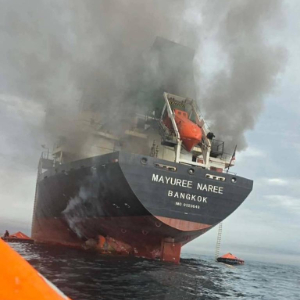 这张泰国海军3月11日发布的照片显示,一艘泰国货船在霍尔木兹海峡海域遭袭起火。新华社发(泰国海军供图)