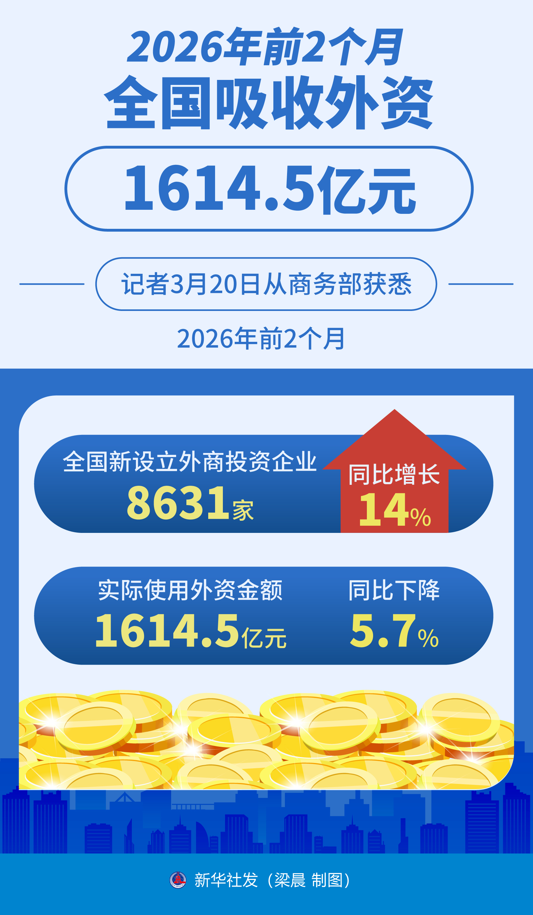 新华社北京3月20日电(记者王聿昊、谢希瑶)记者20日从商务部获悉,今年前2个月,全国新设立外商投资企业8631家,同比增长14%;实际使用外资金额1614.5亿元,同比下降5.7%。