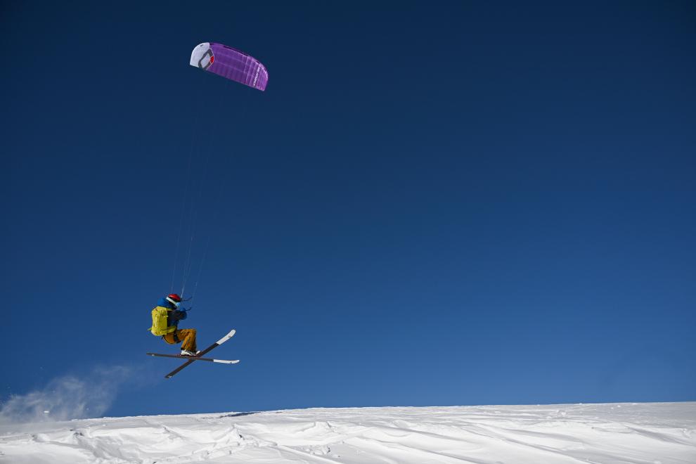 程鹏在滑行中借助风筝腾空跳跃(3月14日摄)。新华社记者 胡虎虎 摄